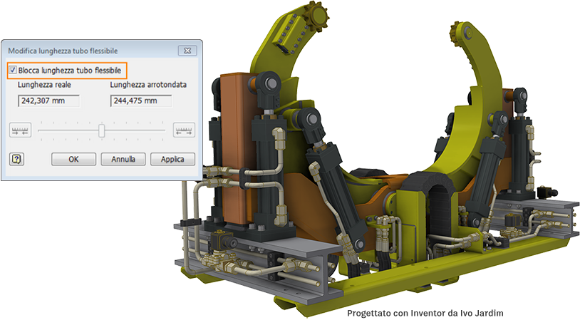 La nuova opzione, Blocca lunghezza tubo flessibile, consente di calcolare una somma esatta della lunghezza del tubo flessibile. Quando è selezionata, se i componenti si spostano, questa opzione impedisce la modifica della lunghezza del tubo flessibile a causa dell'adattività.