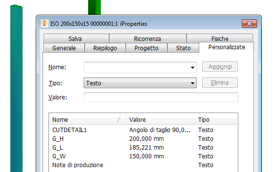 I valori generati applicando il comando Ritaglia/Estendi per tagliare angoli su membri del telaio sono disponibili in iProperties/scheda Personalizzate come CUTDETAIL1, CUTDETAIL2 e così via e possono essere inclusi nella distinta dei componenti e nell'elenco parti. Inoltre, il parametro Generatore telaio G_L segnala la lunghezza corretta.