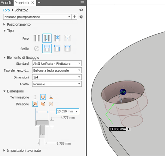 Il nuovo comando Foro è più rapido e intelligente poiché deduce il posizionamento del foro dalle interazioni. È possibile applicare vincoli di quota e concentrici senza dover prima creare uno schizzo. Quindi, passare dalla modifica lavorazione alla modifica schizzo senza uscire dal comando.