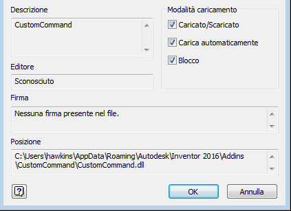 Quando viene caricato un modulo aggiuntivo di un prodotto non Autodesk, viene visualizzata una nuova finestra di dialogo. Ora è possibile scegliere di consentire o bloccare il caricamento di un modulo aggiuntivo. Questa impostazione viene mantenuta per le sessioni successive. È possibile esaminare e modificare le impostazioni Consenti/Blocco utilizzando Gestione moduli aggiuntivi.