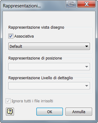 Utilizzare la nuova finestra di dialogo Rappresentazioni per modificare la vista di disegno e l'associatività correnti. Per accedere a questa nuova finestra di dialogo, fare clic con il pulsante destro del mouse sul nodo Esplosione all'interno del browser Modello in una Presentazione e selezionare Rappresentazioni.