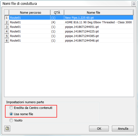 Richiedi nomi file di raccordo (inserisci contenuto personalizzato): selezionando questa opzione è possibile personalizzare il nome dei raccordi all'interno della finestra di dialogo Nomi file di conduttura.