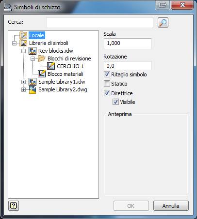 È ora possibile inserire i formati di file IDW o DWG nella libreria di simboli di schizzo. Una libreria di simboli di schizzo può essere creata nei formati IDW e DWG per consentire l'inserimento dei simboli contenuti all'interno del file di libreria da uno dei formati.