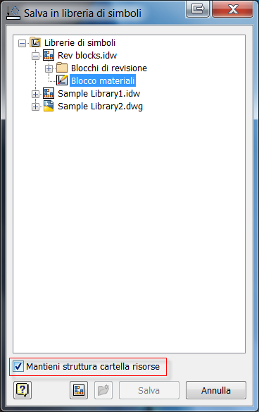 Mantenere la struttura delle cartelle della libreria durante il salvataggio dei simboli di schizzo in una libreria. A tale scopo, selezionare la casella di controllo Mantieni struttura cartella risorse.