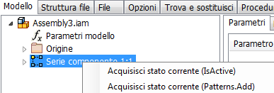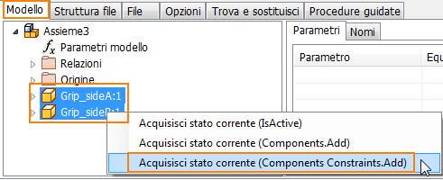 Passaggio 2 Nel file di assiemi, nella finestra di dialogo Modifica regola nella scheda Modello, selezionare i nomi delle parti, fare clic con il pulsante destro del mouse, quindi selezionare Capture.Current.State (Components Constraints.Add) dal menu contestuale. |