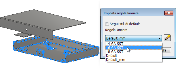 Le parti in lamiera multi-corpo supportano ora regole e spessore univoci per ciascun corpo. È possibile applicare regole multi-corpo a corpi nel browser o durante la creazione di nuovi corpi all'interno delle finestre di dialogo Faccia, Flangia contorno, Profilatura e Tramoggia.