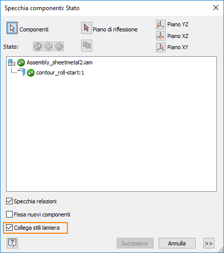 Il comando Specchia componenti riconosce ora la parte in lamiera e consente di collegare lo stile lamiera del componente di origine alla copia speculare.