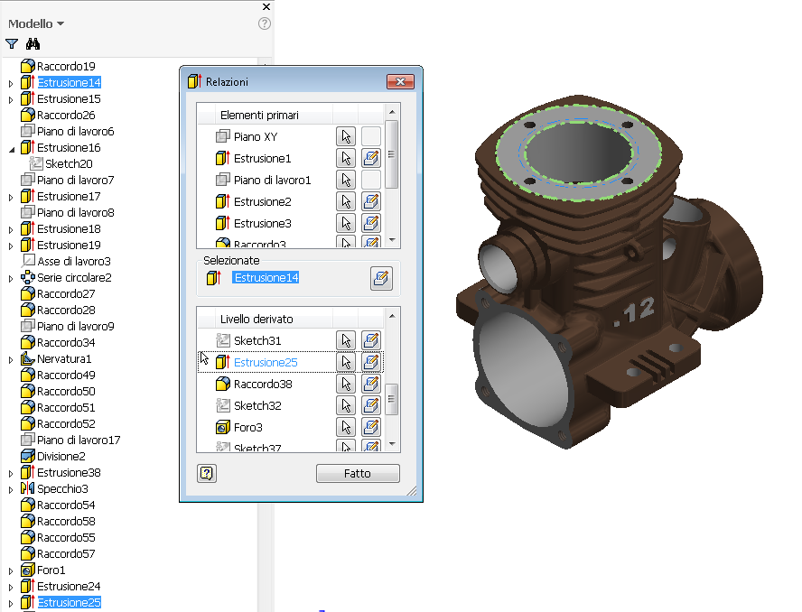Nell'ambiente di una parte, è ora possibile accedere facilmente alle relazioni fra le lavorazioni principali/secondarie di una parte nel browser del modello o nella finestra grafica. Questa nuova finestra di dialogo interattiva consente di visualizzare le dipendenze fra le lavorazioni dall'interno della parte stessa. Nella finestra di dialogo Relazioni, selezionare l'icona