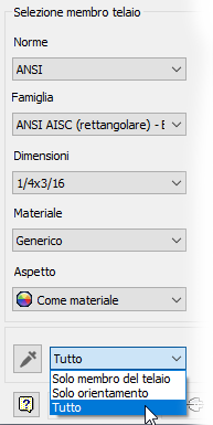 È ora possibile copiare le informazioni dai membri del telaio esistenti quando si utilizzano i comandi Inserisci e Modifica membro. Selezionare il contagocce nella finestra di dialogo per abilitare Copia proprietà e quindi selezionare un membro. È possibile scegliere di copiare solo le informazioni sul membro del telaio, solo l'orientamento o entrambi.