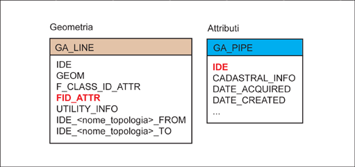Poiché la geometria e gli attributi sono memorizzati separatamente, una classe di entità geografiche geometriche, ad esempio quella Punto, può rappresentare varie classi di entità geografiche di attributo quali Armatura e Raccordo. Per le entità geografiche linea esistono due diversi metodi di divisione della linea: divisione ponderata e divisione forzata.