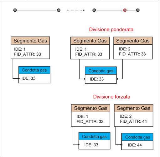 Con la divisione ponderata la linea viene divisa in due entità geografiche diverse. Entrambe hanno una geometria propria (GA_LINE), ma condividono gli stessi dati di attributo (GA_PIPE). Utilizzare la divisione ponderata per le entità geografiche punto di importanza secondaria e gli attributi non modificabili del tubo, ad esempio le armature. |