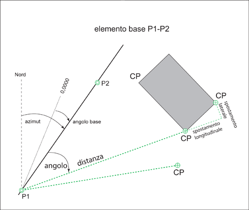 Utilizzare la funzione Calcolo polare per il rilievo polare. L'elemento di base è rappresentato da una linea esistente o può essere definito mediante due punti che si trovano a parte.