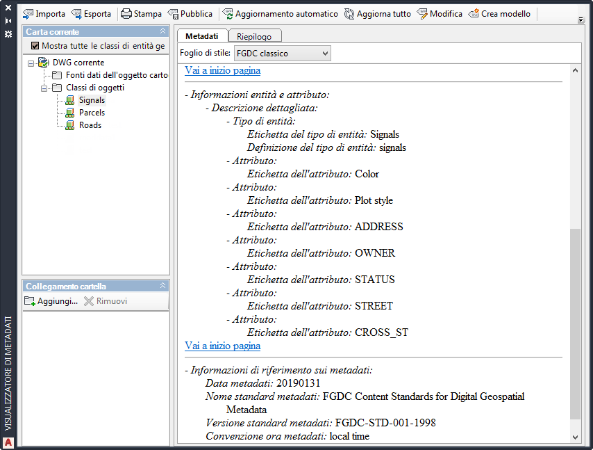 Se una Carta contiene oggetti classificati, i relativi metadati vengono generati e visualizzati automaticamente alla prima apertura del Visualizzatore di metadati.