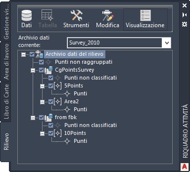 La scheda Rilievo consente di importare e organizzare i punti dati del rilievo.