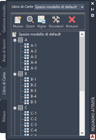 La scheda Libro di Carte consente di creare Carte stampate, libri di Carte e file DWF a più pagine dalle Carte con stili. Libro di Carte utilizza la funzionalità Gestione gruppo di foglidi AutoCAD e fornisce una struttura dei tasselli del libro di Carte analoga alle pagine di un atlante. Per spostarsi tra i tasselli della Carta, utilizzare le frecce di navigazione.