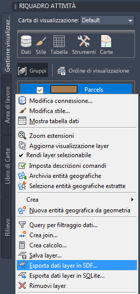 - In Gestione visualizzazioni, fare clic con il pulsante destro del mouse sul layer Parcels e scegliere Esporta dati layer in SDF.
