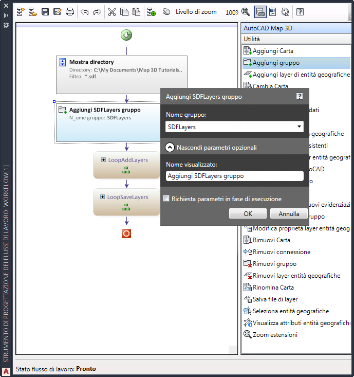 In questa lezione verrà modificato il flusso di lavoro predefinito che crea layer di Gestione visualizzazioni da una cartella contenente file SDF e li salva in file .layer. Verrà creato un gruppo in cui inserire i layer che verranno quindi spostati nel nuovo gruppo.
