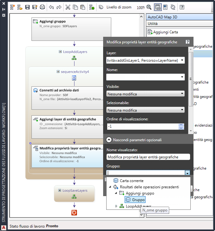 Poiché si desidera modificare la proprietà Gruppo per ciascun layer aggiunto, posizionare questa attività all'interno dell'attività ForEach denominata "LoopAddLayers".