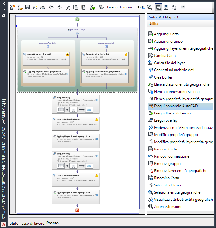 Nel Riquadro Attività, sul lato destro dello Strumento di progettazione dei flussi di lavoro, sono visualizzate due categorie di attività. Le attività di AutoCAD Map 3D toolset sono specifiche di AutoCAD Map 3D toolset, inclusa un'attività che esegue i comandi di AutoCAD.