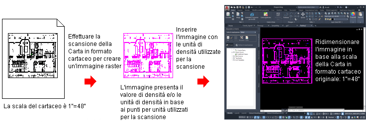 Il seguente esempio illustra il rapporto tra la scala su carta, le unità di densità e la scala di inserimento di un'immagine priva di riferimenti geografici, ovvero salvata senza dati di unità reali. Questa categoria comprende tutte le immagini disegnate utilizzando una scala, ad esempio una planimetria, e acquisite tramite scanner.