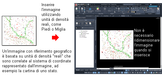 Il seguente esempio illustra il rapporto tra le unità di densità e un'immagine con riferimenti geografici. Poiché non esiste una scala su carta da prendere in considerazione, è possibile inserire l'immagine utilizzando le unità che questa rappresenta, ad esempio i piedi o le miglia, senza doverla ridimensionare in scala all'inserimento.