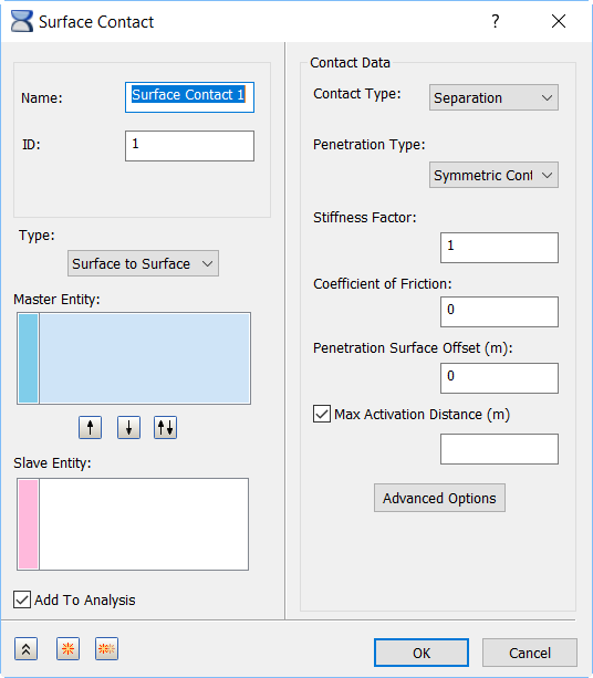Aggiungi ad analisi: i contatti di superficie generati in questo modo possono essere applicati a un'analisi selezionando la casella di controllo Aggiungi ad analisi. È inoltre possibile trascinare o copiare e incollare le coppie di contatto tra il ramo Modello e quello Analisi della struttura. Inoltre, è possibile fare clic con il pulsante destro su Analisi e scegliere Aggiungi/Rimuovi entità dal menu di scelta rapida. Viene visualizzata la seguente finestra di dialogo: