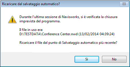 - Avviare Autodesk Navisworks. Viene automaticamente visualizzato un messaggio che richiede di ricaricare l'ultimo file utilizzato.