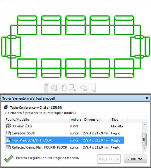 nella finestra Trova l'elemento in altri fogli e modelli, fare clic sul pulsante Prepara tutto. Una volta che tutti i fogli o modelli sono stati preparati, viene visualizzato un elenco di tutti i fogli o modelli che contengono l'oggetto.