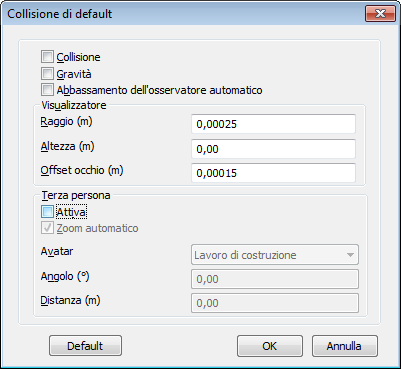 - Nella finestra di dialogo Collisione di default, selezionare le opzioni di default per l'inizializzazione di Autodesk Navisworks.