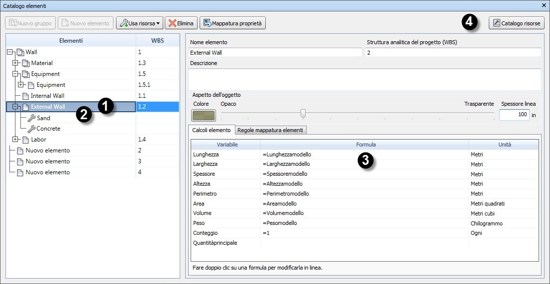 Il Catalogo elementi è il database organizzativo per la valutazione. Il Catalogo elementi e il Catalogo risorse hanno la stessa struttura, composta da una struttura di selezione, un pannello delle variabili e le informazioni generali. Gli elementi del Catalogo elementi possono essere associati direttamente a un oggetto modello, ad esempio un muro o una finestra. Gli elementi possono esistere in modo indipendente oppure possono contenere risorse.