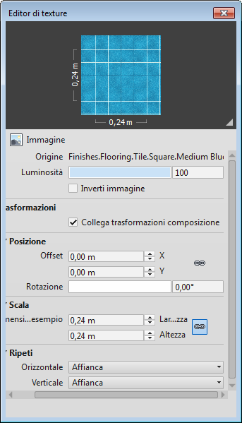 Per aprire l'Editor di texture, fare clic sul campione di una texture nell'Editor dei materiali. Le modifiche apportate alle impostazioni delle texture vengono visualizzate nel campione di anteprima. È possibile trascinare l'angolo dell'anteprima per ingrandire o ridurre l'immagine visualizzata.