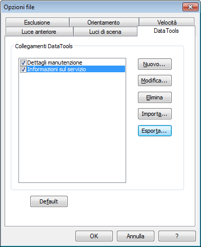 Nella scheda DataTools della finestra di dialogo Opzioni file, fare clic sul collegamento da esportare nell'area Collegamenti DataTools, quindi fare clic sul pulsante Esporta.