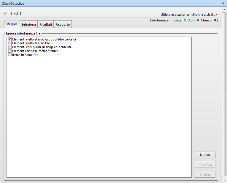 Regole consente di definire e personalizzare le regole da applicare ai test di interferenza e visualizza un elenco di tutte le regole correntemente disponibili. Queste regole possono essere utilizzate in modo tale che