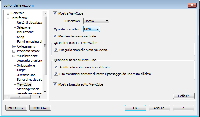 - Nell'Editor delle opzioni, nella pagina ViewCube del nodo Interfaccia, selezionare un'opzione dall'elenco a discesa Trasparenza se non attivo.
