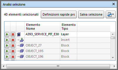 Analisi selezione è una finestra agganciabile che consente di visualizzare un elenco di tutti gli oggetti selezionati e le proprietà rapide associati a tali oggetti.