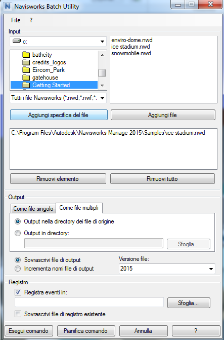 Batch Utility In alternativa, è possibile fare clic sul pulsante Aggiungi specifica file. In tal modo Autodesk Navisworks eseguirà la conversione dei file contenuti nella cartella selezionata. I file che verranno convertiti sono determinati in base all'opzione selezionata nel menu Tipo di file.