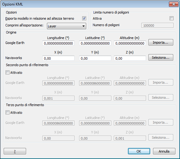 Tali punti devono essere visibili nella vista scena prima dell'esportazione, poiché una volta visualizzata la finestra di dialogo Opzioni KML, non è possibile navigare fino a quando non si effettua la selezione.