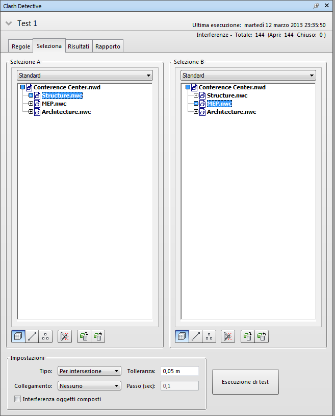 Questi riquadri contengono una vista struttura di due gruppi di elementi che vengono verificati tra loro durante il test di interferenza. È necessario selezionare elementi in ogni riquadro.