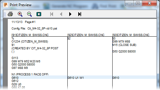 When the NC Program window displays aligned, multi-channel output, PartMaker also reflects this layout in printed output. For example: