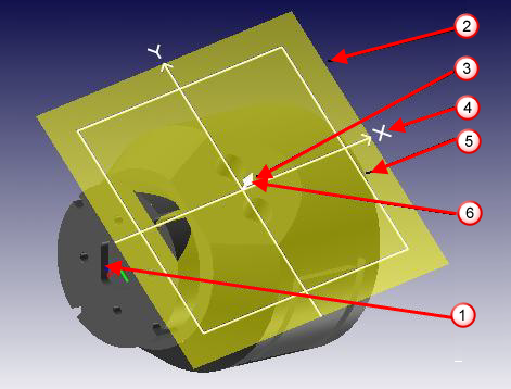 Face Coordinate System (FCS) — The Face Coordinate System of a given Face window is the 3D coordinate system consisting of the two axes of the Face Plane and the third axis perpendicular to the Face Plane and passing through the Face Origin. The Face Coordinate System Axes are displayed in white on the solid model.