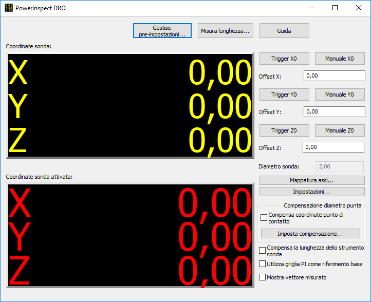- In base alle impostazioni di default, il DRO indica la posizione alla fine dell'albero. Selezionare la casella di controllo Compensa la lunghezza dello strumento sonda per indicare la posizione della punta della sonda.