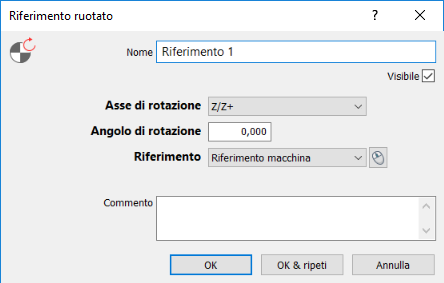 Utilizzare l'elemento Riferimento ruotato per creare un riferimento ruotando un riferimento esistente attorno a uno dei suoi assi principali secondo un'angolazione specificata.