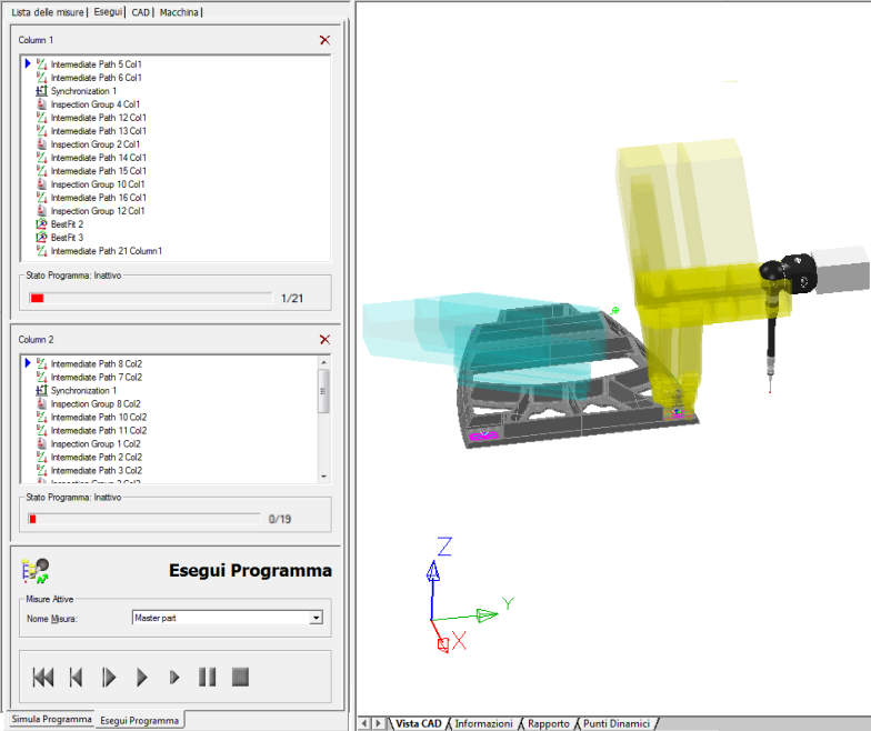 Nella modalità a testa doppia, gli elementi associati a ogni testa sono visualizzati in sezioni separate della scheda Esegui programma. Ciò consente di controllare quali teste sono in esecuzione, visualizzare l'avanzamento dell'ispezione in ogni testa quando sono simultaneamente in esecuzione e specificare intervalli separati per ogni insieme di elementi. In base alle impostazioni di default, la vista CAD visualizza anche i movimenti previsti di ogni testa, in modo che sia possibile verificare le posizioni relative ed evitare potenziali collisioni.