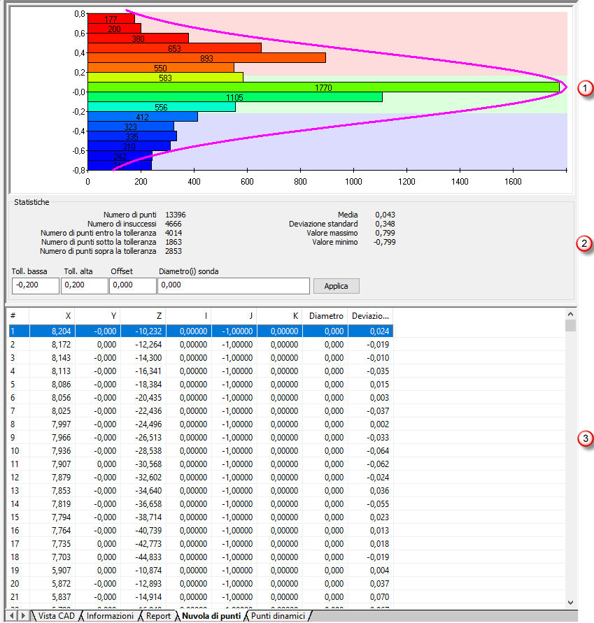 Statistiche: visualizza informazioni sulla nuvola di punti e il numero di punti sopra, entro e sotto la tolleranza. Per modificare le tolleranze, l'offset di superficie o il diametro della sonda della nuvola di punti, inserire nuovi valori nelle caselle pertinenti e fare clic su Applica.