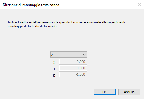 - Nella finestra di dialogo Direzione di montaggio testa sonda, selezionare una voce nell'elenco a discesa per specificare a quale asse della macchina è parallela la testa.