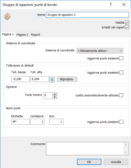 Selezionare la casella di controllo Aggiorna punti esistenti per applicare i valori ai punti già presenti nel gruppo. Selezionare Ripristina per ripristinare i valori di default specificati nella finestra di dialogo Parametri di misura.