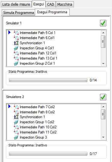 Ad esempio, nella sequenza di ispezione qui di seguito, l'elemento Sincronizzazione obbliga PowerInspect a completare tutti gli elementi precedenti prima di consentire alle teste di proseguire con la misurazione dei gruppi di ispezioni: