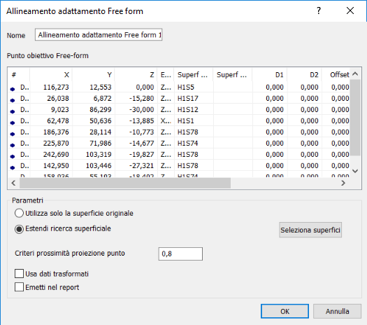 Nota: I punti nell'allineamento Free form non sono aggiornati una volta salvati. Per modificare i punti rilevati, eliminare l'elemento dell'allineamento esistente e crearne uno nuovo.