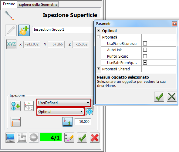 per specificare l'altezza di sicurezza da utilizzare quando si misura la feature. Per un metodo ottimale, questa operazione imposta la distanza di approccio prima della prima posizione rilevata, e la distanza di ritrazione dopo l'ultima posizione rilevata.