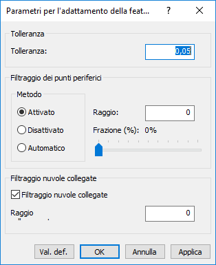 Utilizzare la finestra di dialogo Parametri per l'adattamento della feature per modificare i parametri che controllano la modalità con cui le feature geometriche 3D vengono selezionate da una nuvola di punti.
